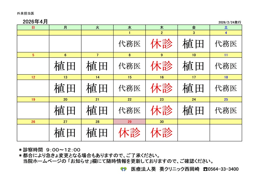 2026年4月 診察スケジュール